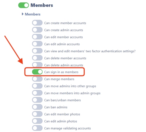 Volladministratoren haben standardmäßig diese Berechtigung. Um Benutzer einzurichten, die den Button verwenden können, gehe in AdminCP zu Benutzer -> Team -> Administratoren. Wähle eine bestehende Gruppe oder klicke auf Administrator hinzufügen und erlaube den Zugriff für System -> Benutzer-> Kann sich als Benutzer anmelden.